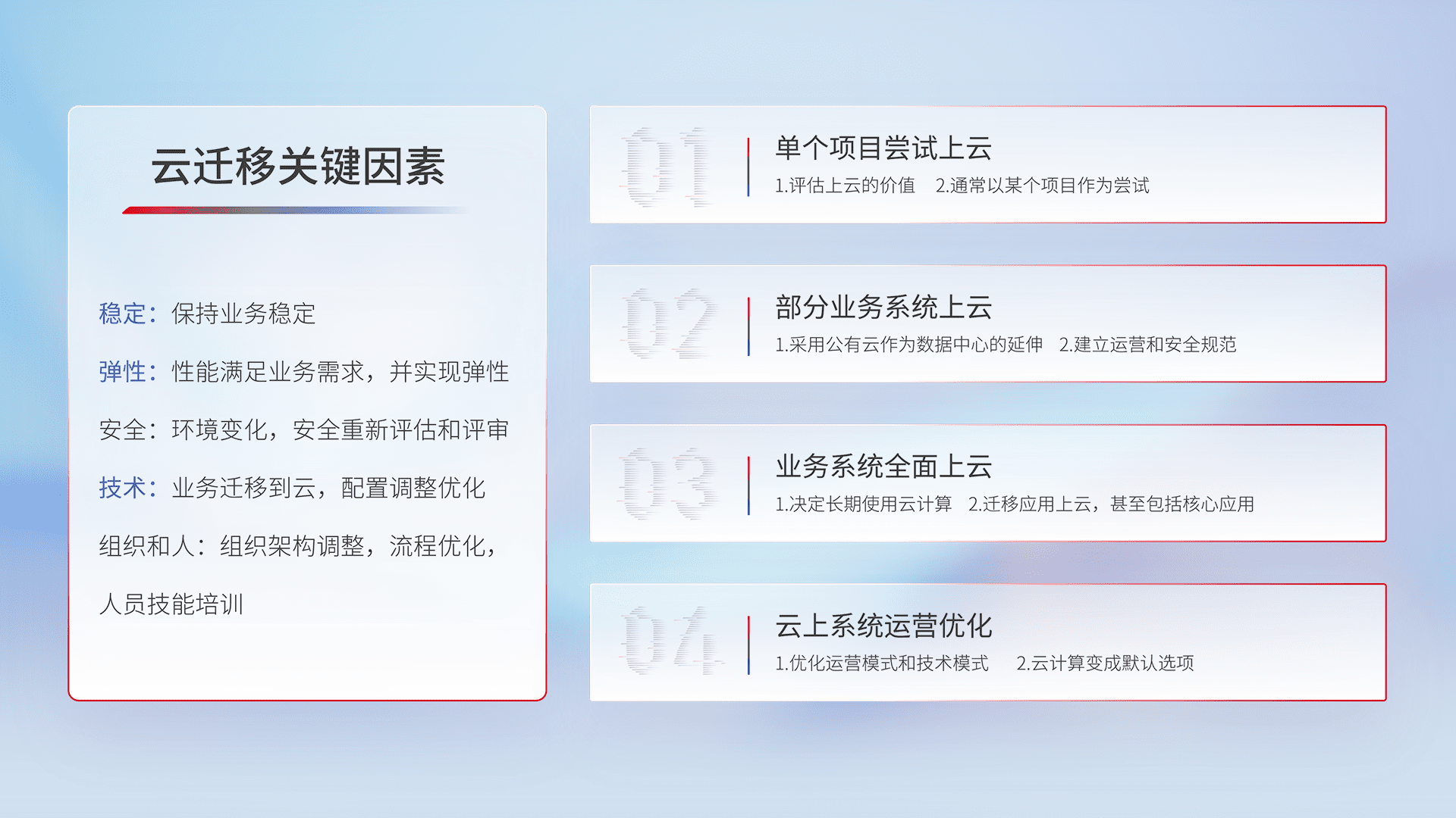 结合实际业务,,,从规划设计、、云平台选型、、、云原生改造、、数据迁移、、、、集成交付,,,,迁移全过程为客户识别最佳上云路径,,,,做好风险识别管理,,,,设计网络架构、、、、身份权限、、、、安全审计合规、、、操作审计、、、、日志审计、、、监控告警策略、、、多站点容灾设计等,,对云上基础设施进行整体规划,,,提升IT治理水平,,,以满足弹性、、、高可用、、、高性能的需求。。。