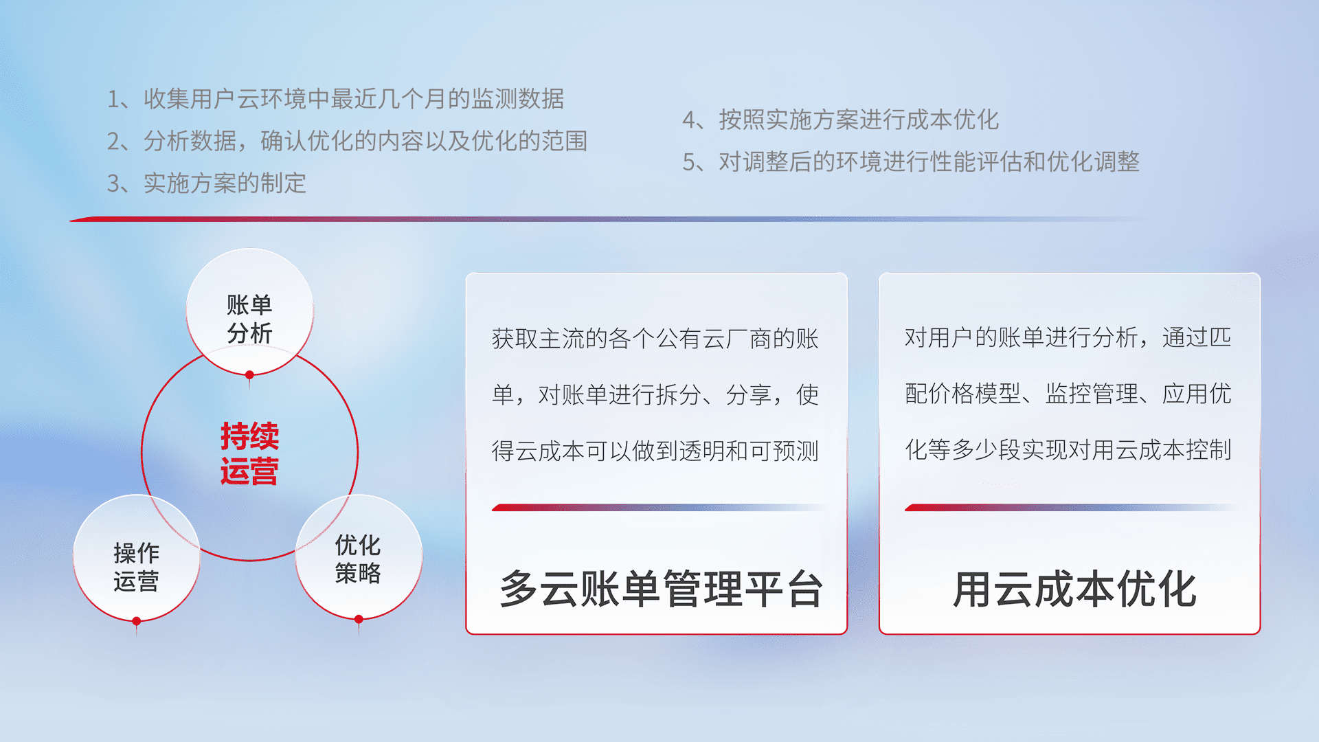 通过多云纳管,,,以统一的资源数据模型把客户的云资源进行抽象和封装,,,,进而实现对多云资源的统一操作,,,,保障云资源管理的可靠性、、稳定性与可用性。。。量身定制化运维内容,,,配置、、、、开发运维、、、补丁管理、、、备份、、监控、、、、认证和访问管理、、、审计和日常巡检等,,,保障在用云过程中的可靠度,,,稳定度以及高可用率。。